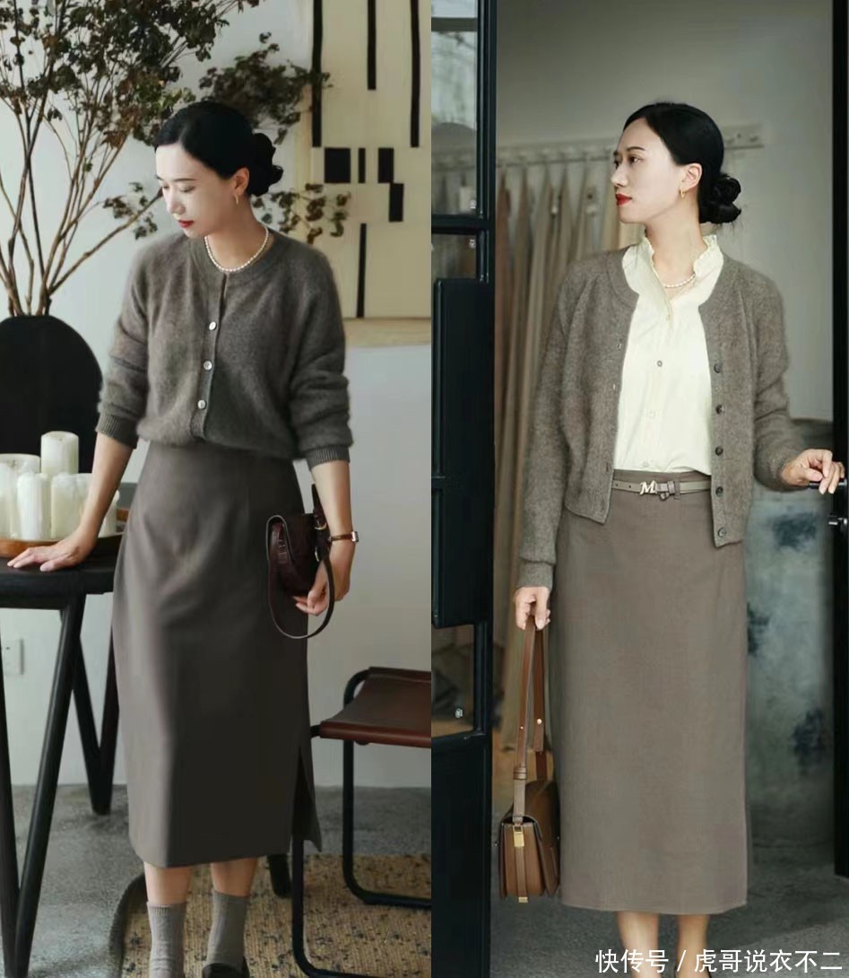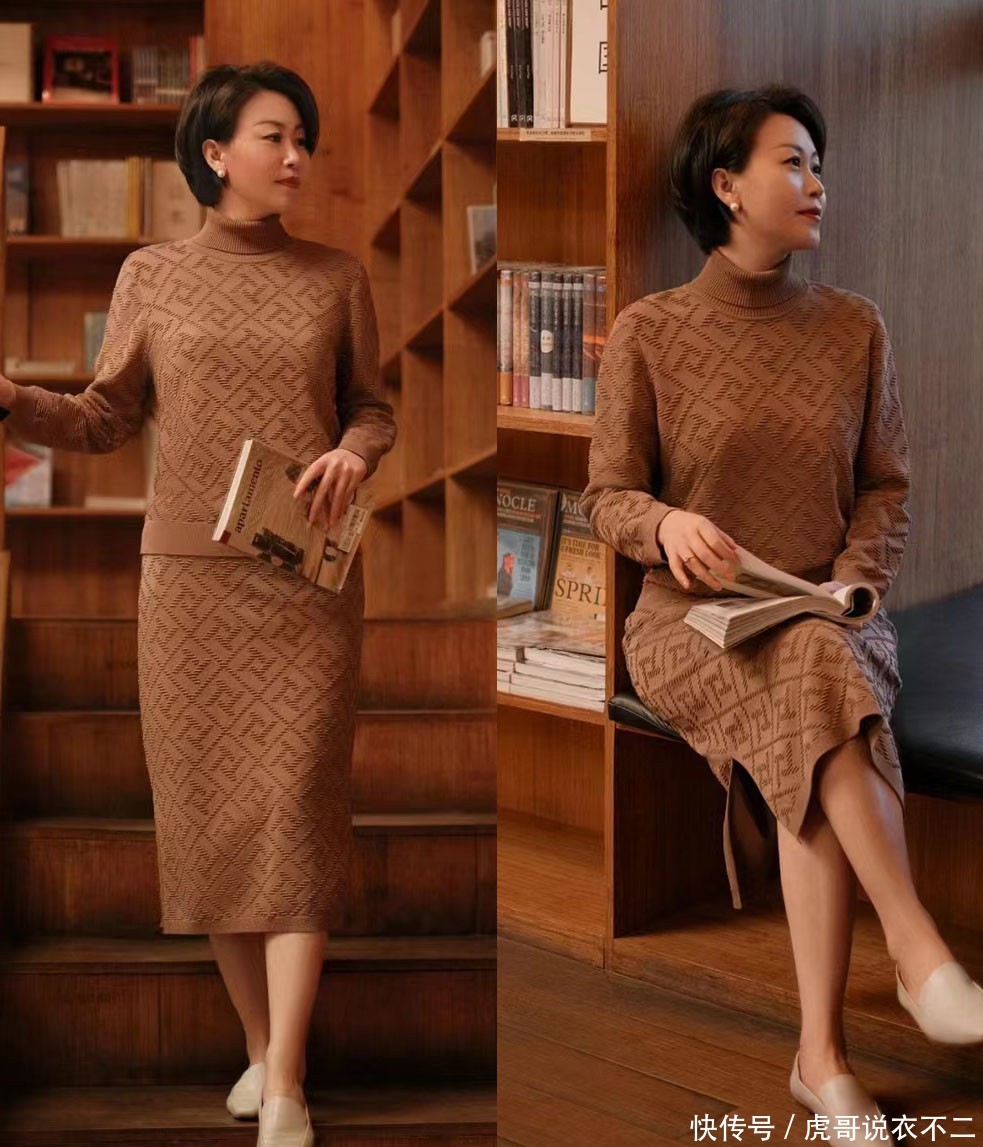 譬如说好多女性就心爱同色系的穿搭,高下服装凯旋应用归并种心计,当然也省去了念念索的期间。譬如说上图这身棕色系的造型,遴荐了毛衣与针织半身裙,尽头庸俗的散漫出了浓厚的和善气味。