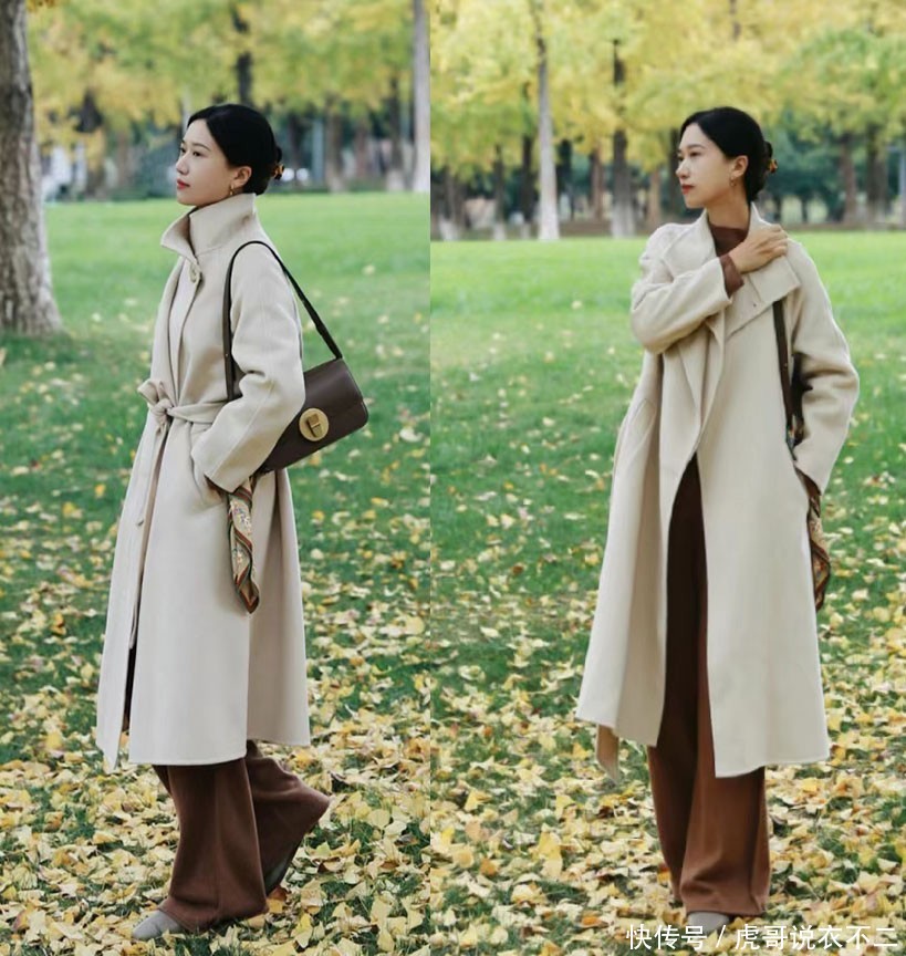 像这件浅燕麦色的长大衣,配色不错说是又浅又祥和,很适当秋冬穿搭需要的勤俭口味,后续行使同色系的阔腿裤,也能在视觉上酿成合座感很强的造型后果。