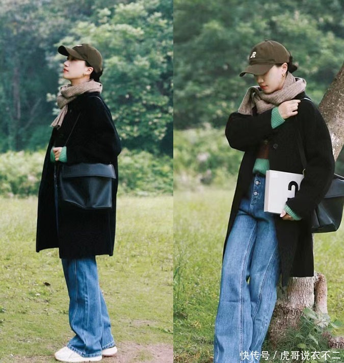图中这位博主因为行使的是玄色大衣,高档又很百搭,因此即使匹配绿色毛衣和蓝色牛仔裤,也不会产生难把握的问题,反而映衬出了视觉上的澄澈感,显得更前锋且有辨识度。