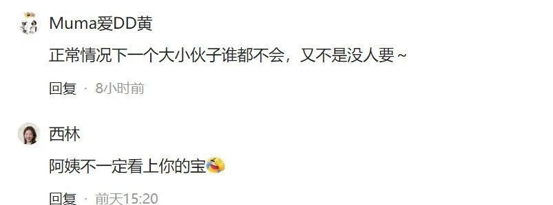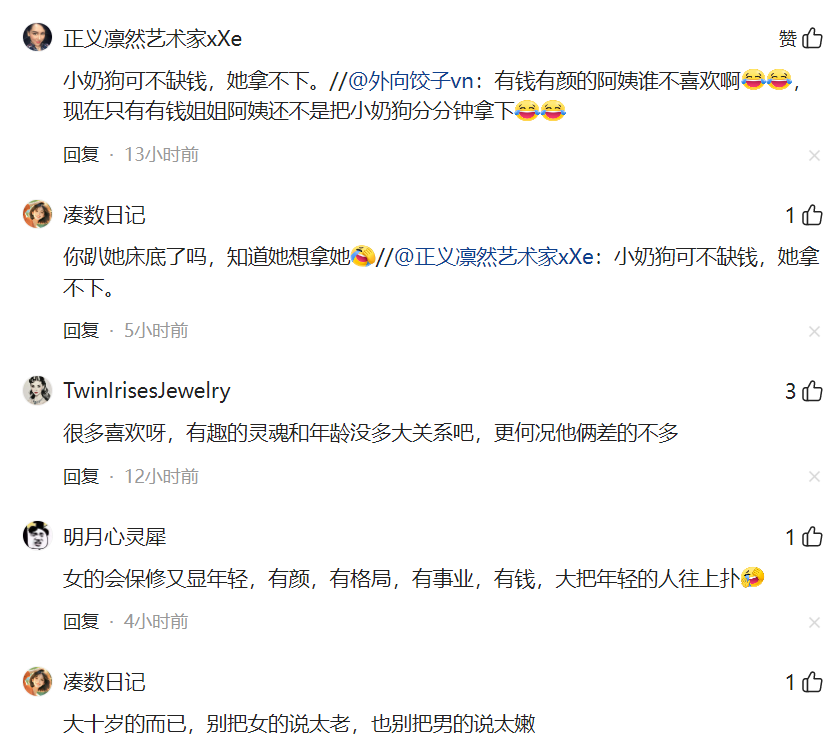 是以不怡然这些话的东说念主回怼:“大姨不一定看得上你的宝。”还说“有钱有颜的大姨谁不心爱啊,要小奶狗不是分分钟拿下?”但还击的东说念主以为“小奶狗不缺钱,她拿不下。”回怼的东说念主反问:“你怎么知说念她思拿下?”