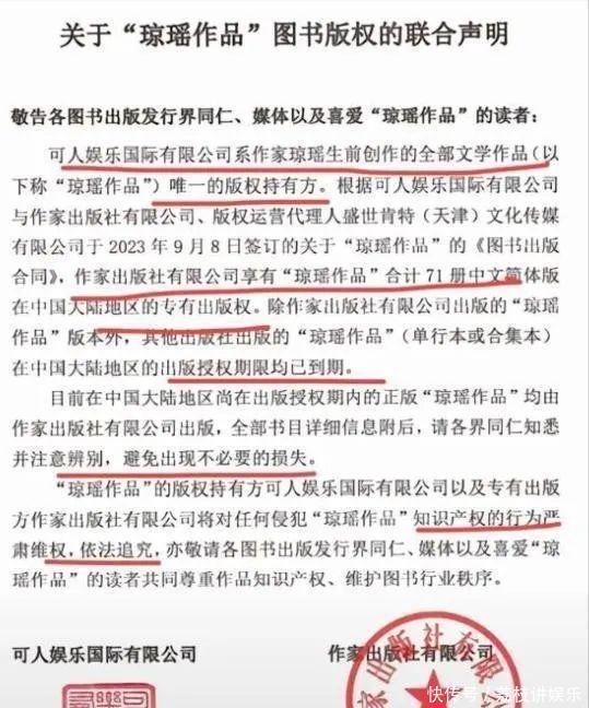 在琼瑶弃世第二天,何秀琼就发布声明,文牍琼瑶在内地刊行出书的的全部作品,惟一版权持有方是其掌控的可东谈主文娱,出书社与其他家的互助均已到期,字字未提王冠,却句句直指王冠。
